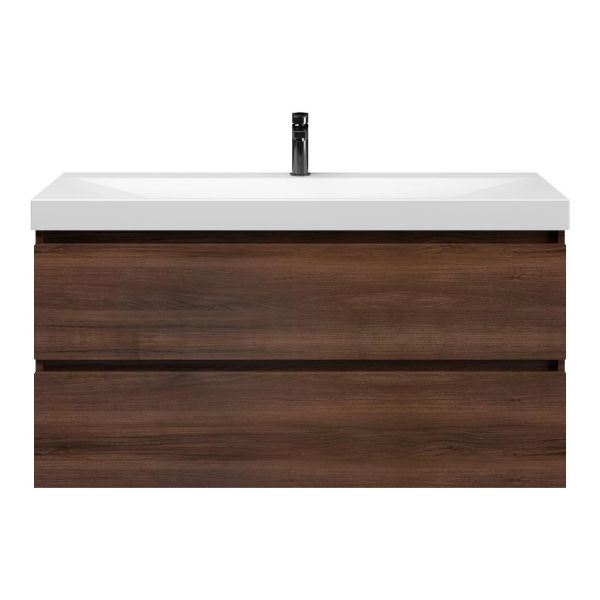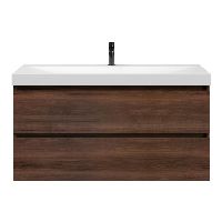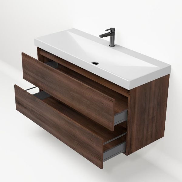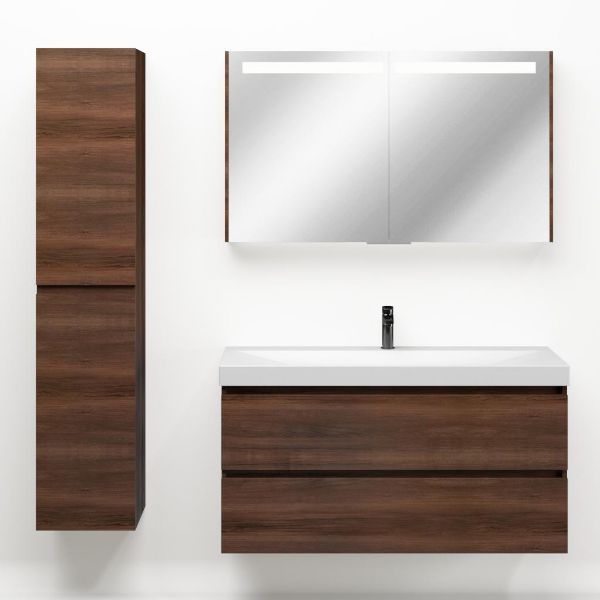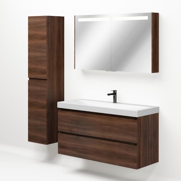 Greeploos badkamermeubel in de kleur walnoot is 120 cm breed. De wastafel is vervaardig in keramiek en heeft de kleur wit mat keramiek. Dit badkamermeubel met deze wastafel is leverbaar in 120 cm.