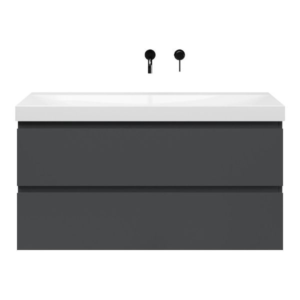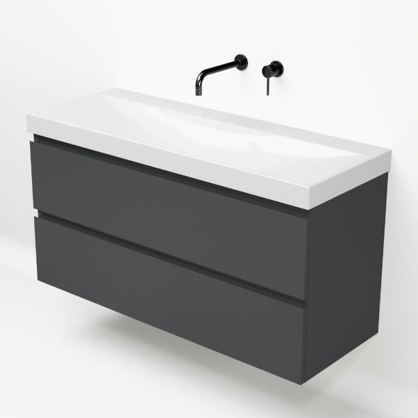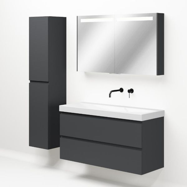 Greeploos badkamermeubel in de kleur antraciet mat is 120 cm breed. De wastafel is vervaardig in keramiek en heeft de kleur wit glans. Dit badkamermeubel met deze wastafel is leverbaar in 120 cm.