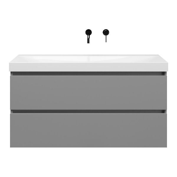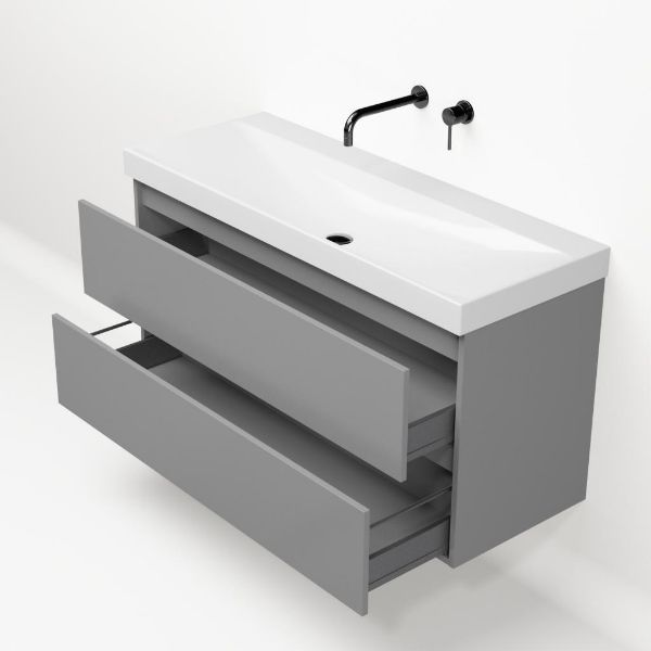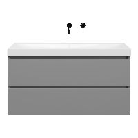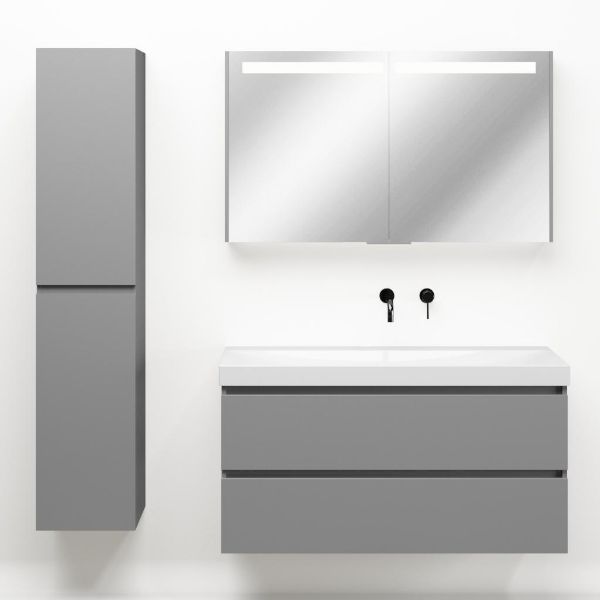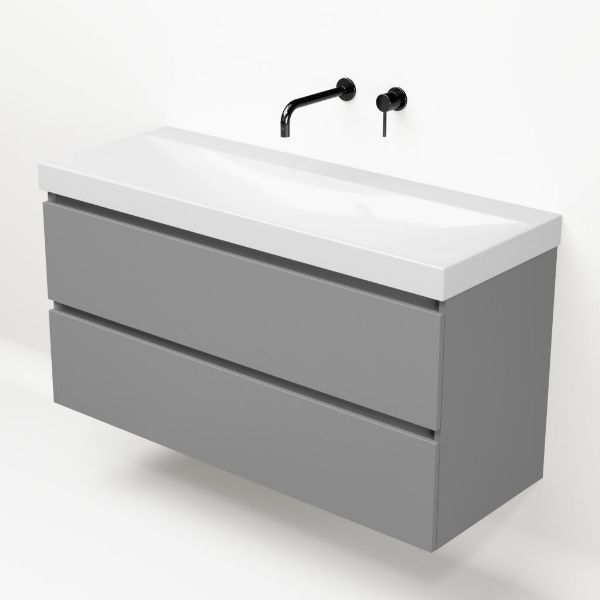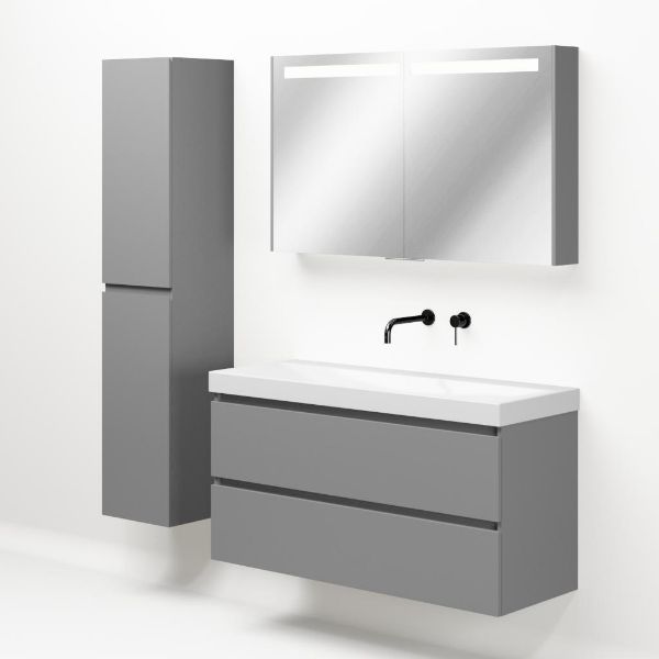 Greeploos badkamermeubel in de kleur licht grijs mat is 120 cm breed. De wastafel is vervaardig in keramiek en heeft de kleur wit glans. Dit badkamermeubel met deze wastafel is leverbaar in 120 cm.
