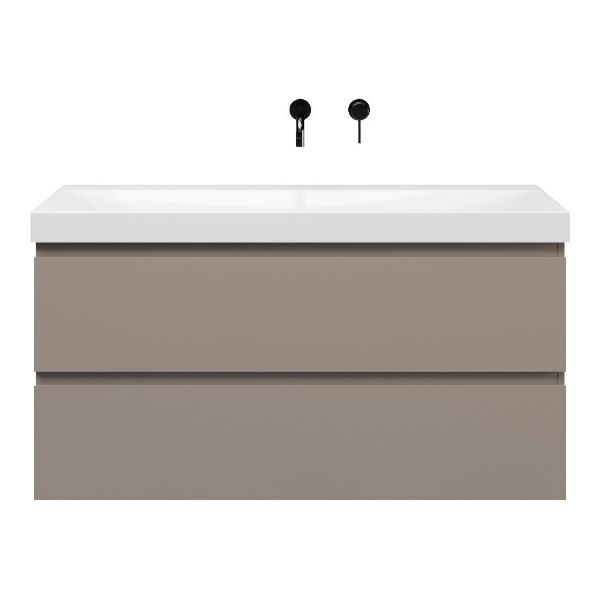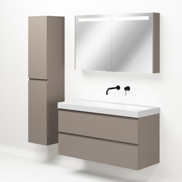 Greeploos badkamermeubel in de kleur taupe is 120 cm breed. De wastafel is vervaardig in keramiek en heeft de kleur wit glans. Dit badkamermeubel met deze wastafel is leverbaar in 120 cm.