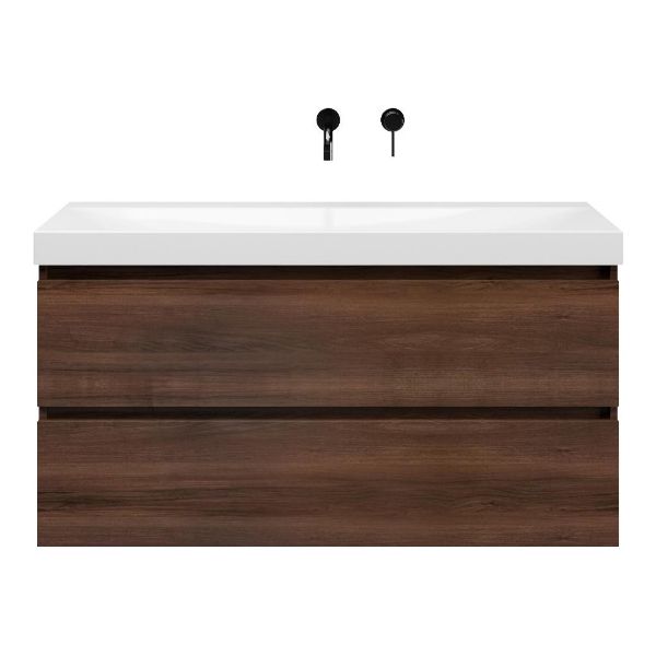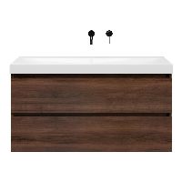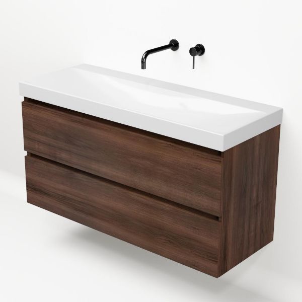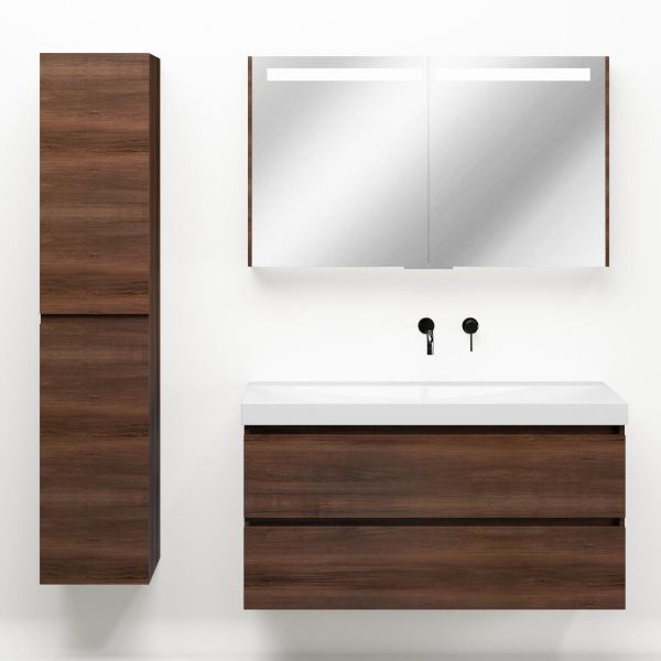 Greeploos badkamermeubel in de kleur walnoot is 120 cm breed. De wastafel is vervaardig in keramiek en heeft de kleur wit glans. Dit badkamermeubel met deze wastafel is leverbaar in 120 cm.