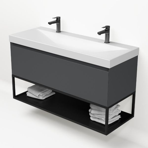 Bellanti Solo/Tela/Jenthe badmeubel 120x46 1 softclose lade antraciet mat greeploos keramische wastafel wit mat met 2 kraangaten met mat zwart metalen frame
