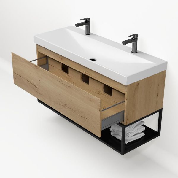 Bellanti Solo/Tela/Jenthe badmeubel 120x46 1 softclose lade eiken natuur greeploos keramische wastafel wit mat met 2 kraangaten met mat zwart metalen frame