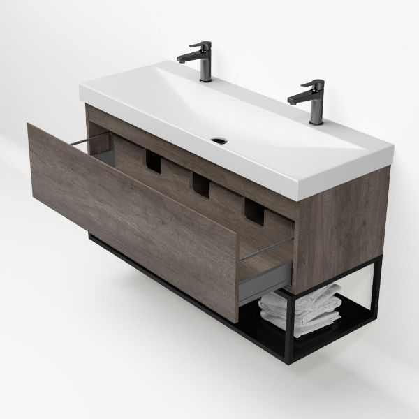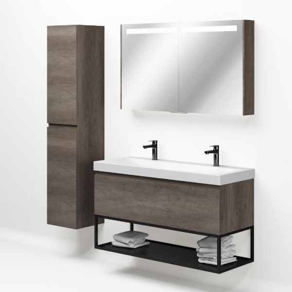 Greeploos badkamermeubel in de kleur olm donker grijs is 120 cm breed.  De wastafel is vervaardig in keramiek en heeft de kleur wit mat. Dit badkamermeubel met deze wastafel is leverbaar tussen de 60 cm t/m 140 cm