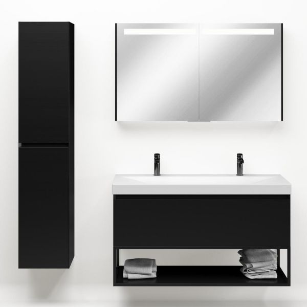 Greeploos badkamermeubel in de kleur zwart mat is 120 cm breed.  De wastafel is vervaardig in keramiek en heeft de kleur wit mat. Dit badkamermeubel met deze wastafel is leverbaar tussen de 60 cm t/m 140 cm