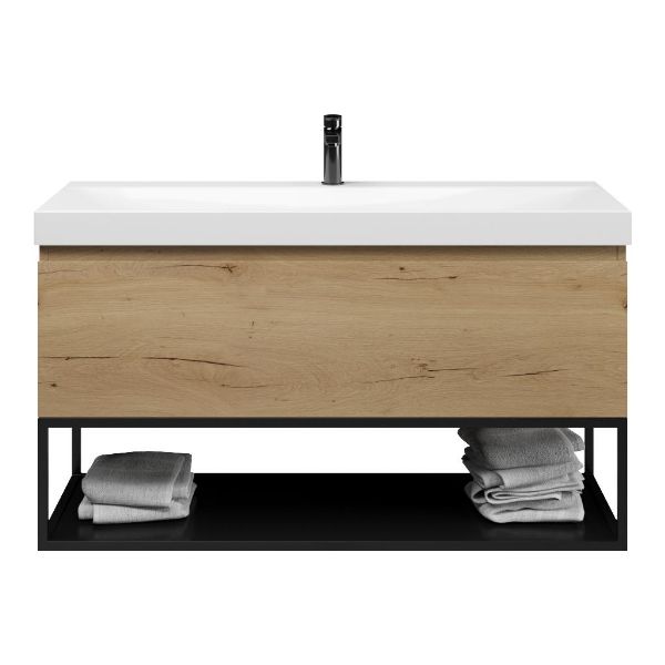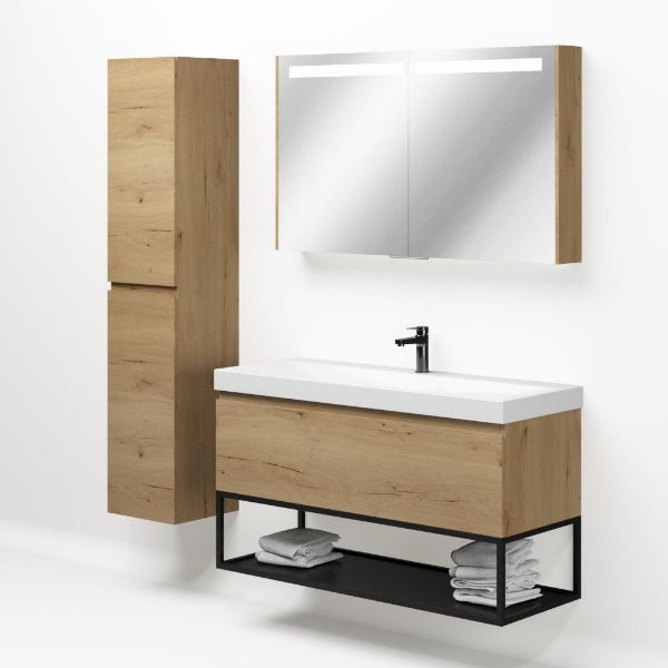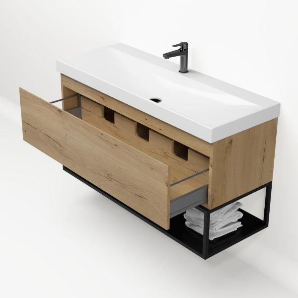 Bellanti Solo/Tela/Jenthe badmeubel 120x46 1 softclose lade eiken natuur greeploos keramische wastafel wit glans met 1 kraangat met mat zwart metalen frame