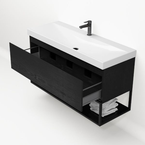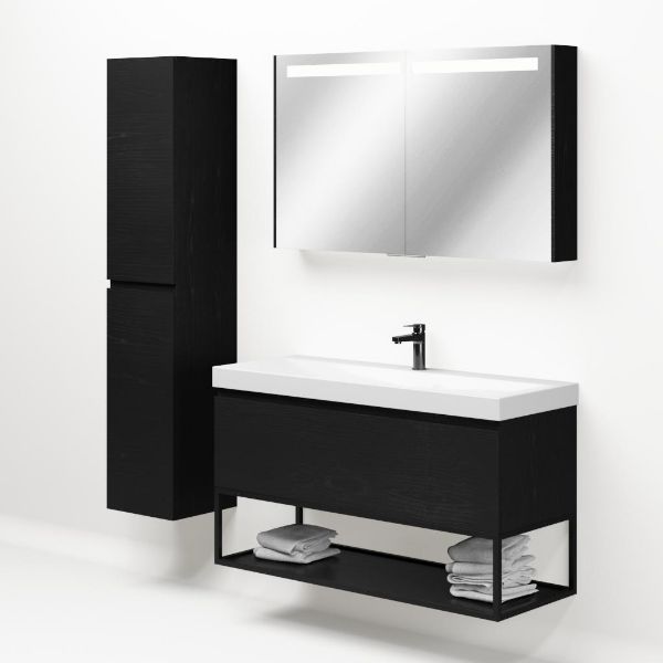 Greeploos badkamermeubel in de kleur zwart mat eiken is 120 cm breed.  De wastafel is vervaardig in keramiek en heeft de kleur wit glans. Dit badkamermeubel met deze wastafel is leverbaar tussen de 60 cm t/m 140 cm