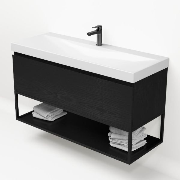 Bellanti Solo/Tela/Jenthe badmeubel 120x46 1 softclose lade mat zwart eiken greeploos keramische wastafel wit glans met 1 kraangat met mat zwart metalen frame