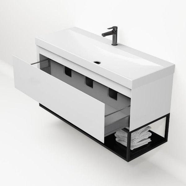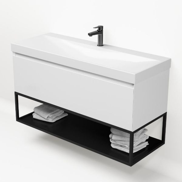 Bellanti Solo/Tela/Jenthe badmeubel 120x46 1 softclose lade wit hoogglans greeploos keramische wastafel wit glans met 1 kraangat met mat zwart metalen frame