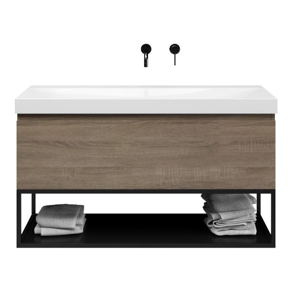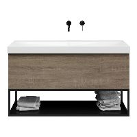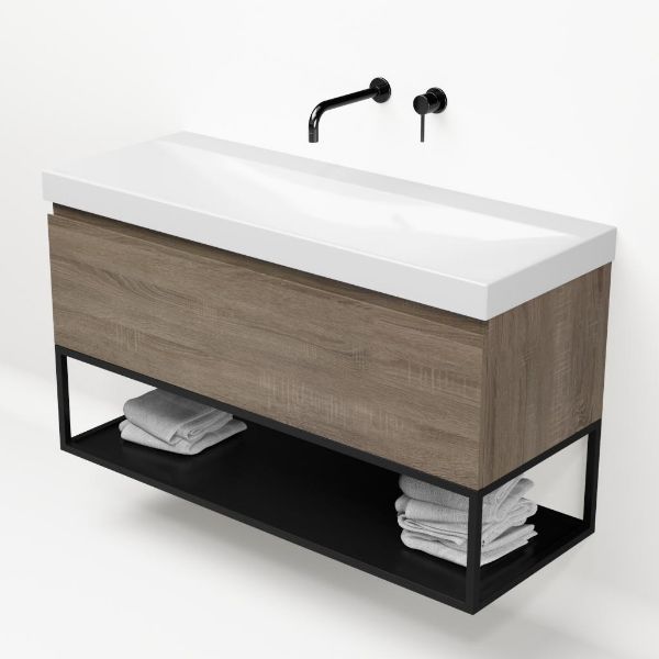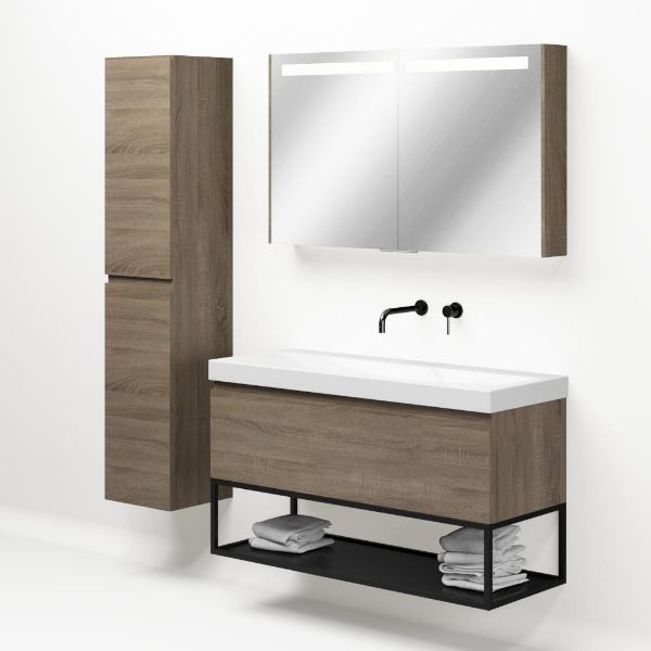 Bellanti Solo/Tela/Jenthe badmeubel 120x46 1 softclose lade eiken donker greeploos keramische wastafel wit glans zonder kraangaten met mat zwart metalen frame