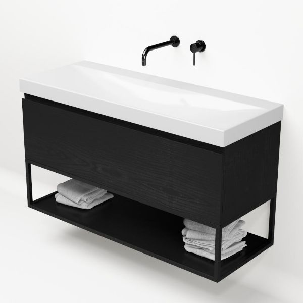 Bellanti Solo/Tela/Jenthe badmeubel 120x46 1 softclose lade mat zwart eiken greeploos keramische wastafel wit glans zonder kraangaten met mat zwart metalen frame