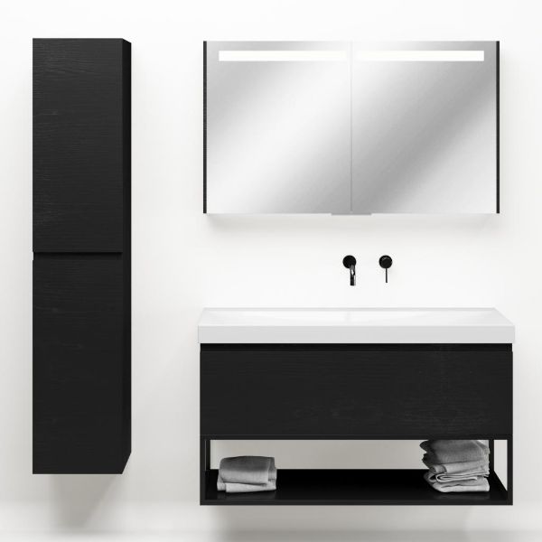 Greeploos badkamermeubel in de kleur zwart mat eiken is 120 cm breed.  De wastafel is vervaardig in keramiek en heeft de kleur wit glans. Dit badkamermeubel met deze wastafel is leverbaar tussen de 60 cm t/m 140 cm