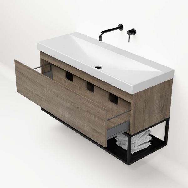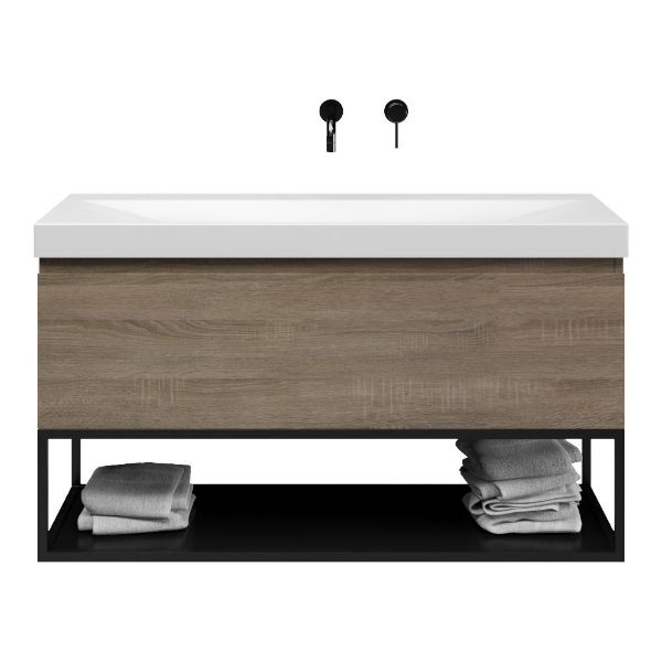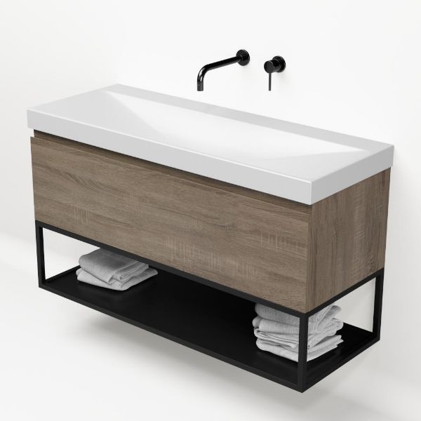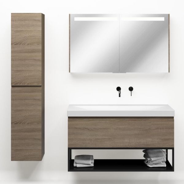 Bellanti Solo/Tela/Jenthe badmeubel 120x46 1 softclose lade eiken donker greeploos keramische wastafel wit mat zonder kraangaten met mat zwart metalen frame