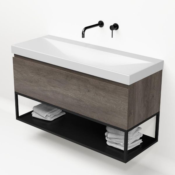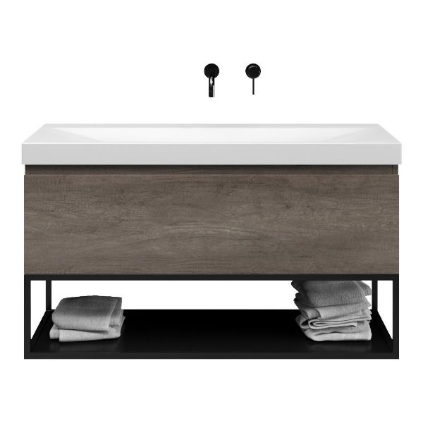 Bellanti Solo/Tela/Jenthe badmeubel 120x46 1 softclose lade olm donker grijs greeploos keramische wastafel wit mat zonder kraangaten met mat zwart metalen frame