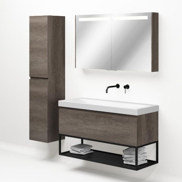 Greeploos badkamermeubel in de kleur olm donker grijs is 120 cm breed.  De wastafel is vervaardig in keramiek en heeft de kleur wit mat. Dit badkamermeubel met deze wastafel is leverbaar tussen de 60 cm t/m 140 cm