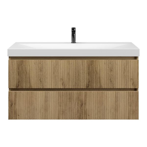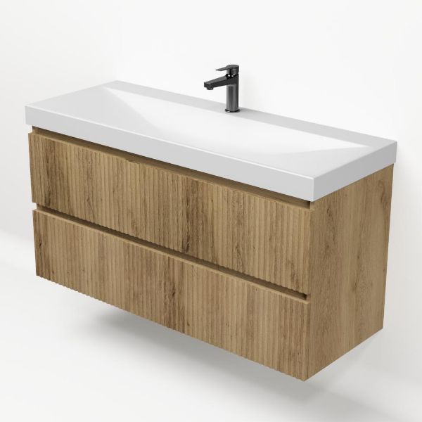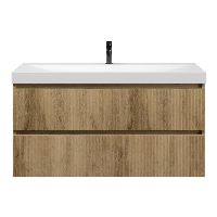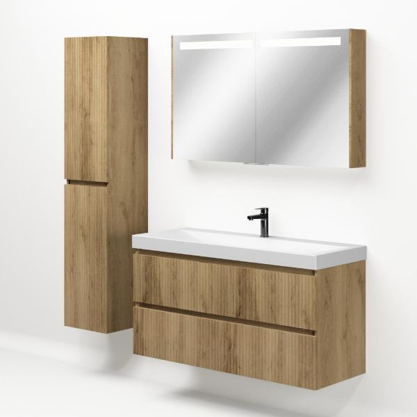 Greeploos badkamermeubel in de kleur eiken warm met met ribbel - latjes structuur is 120 cm breed. De wastafel is vervaardig in keramiek en heeft de kleur wit mat keramiek. Dit badkamermeubel met deze wastafel is leverbaar in de 100 en 120 cm