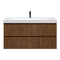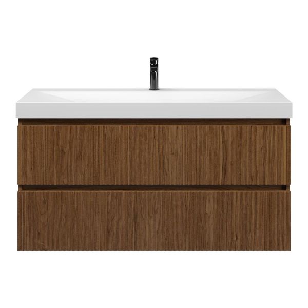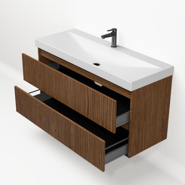 Greeploos badkamermeubel in de kleur warm noten met met ribbel - latjes structuur is 120 cm breed. De wastafel is vervaardig in keramiek en heeft de kleur wit mat keramiek. Dit badkamermeubel met deze wastafel is leverbaar in de 100 en 120 cm