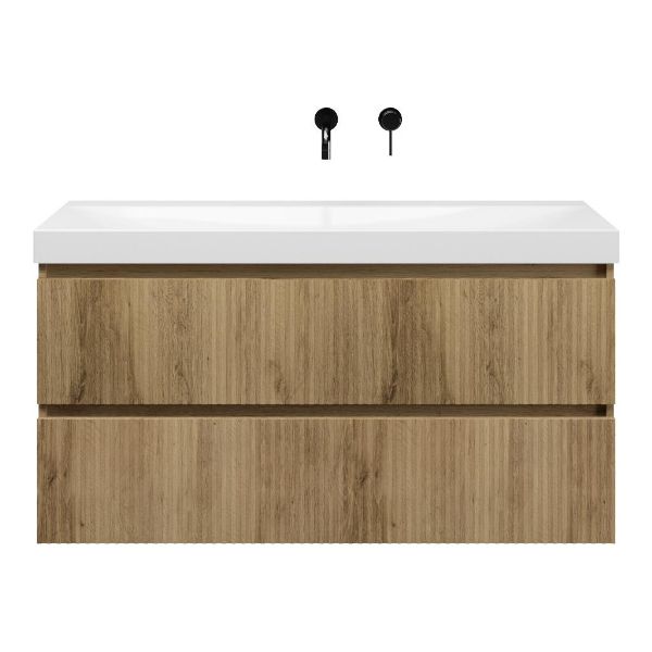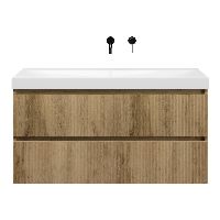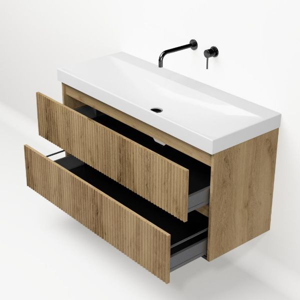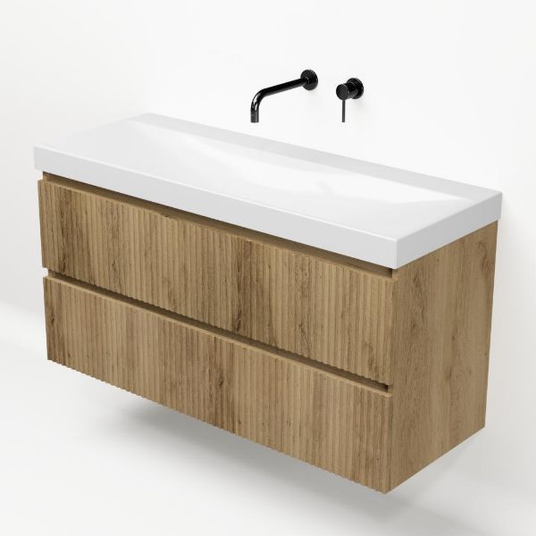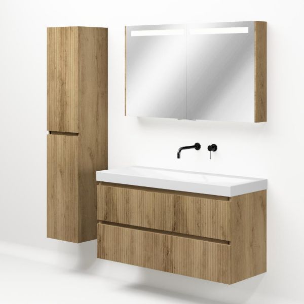 Greeploos badkamermeubel in de kleur eiken warm met met ribbel - latjes structuur is 120 cm breed. De wastafel is vervaardig in keramiek en heeft de kleur wit glans. Dit badkamermeubel met deze wastafel is leverbaar in de 100 en 120 cm