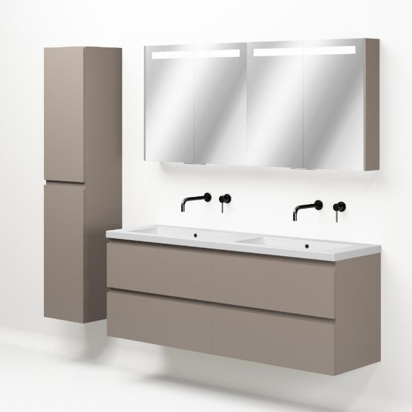 Greeploos badkamermeubel in de kleur taupe is 160 cm breed.  De wastafel is vervaardig in quartz en heeft de kleur wit mat. Dit badkamermeubel met deze wastafel is leverbaar tussen de 60 cm t/m 200 cm