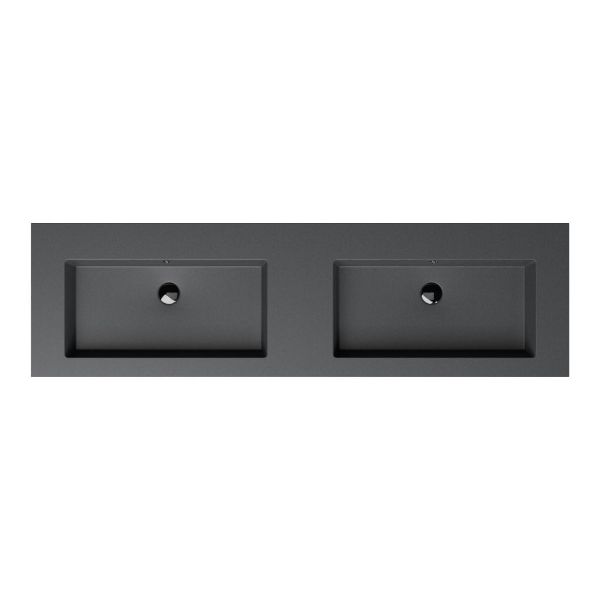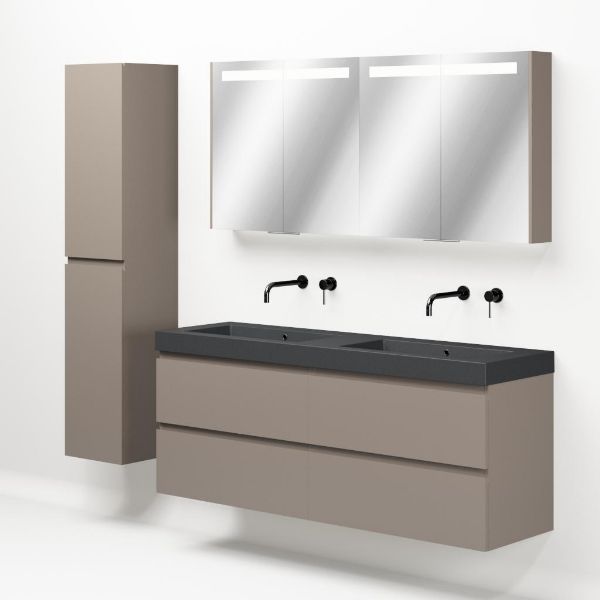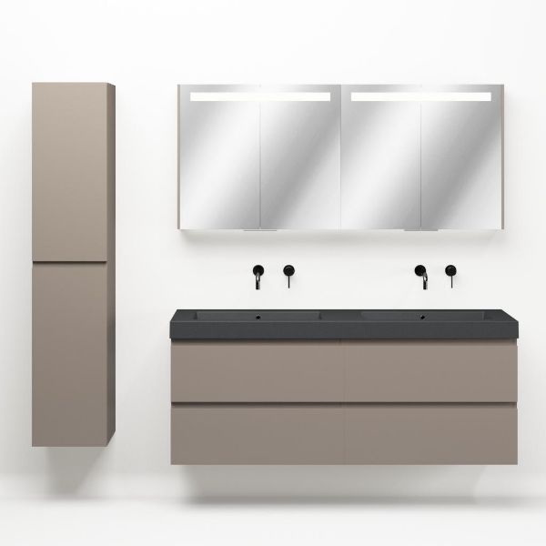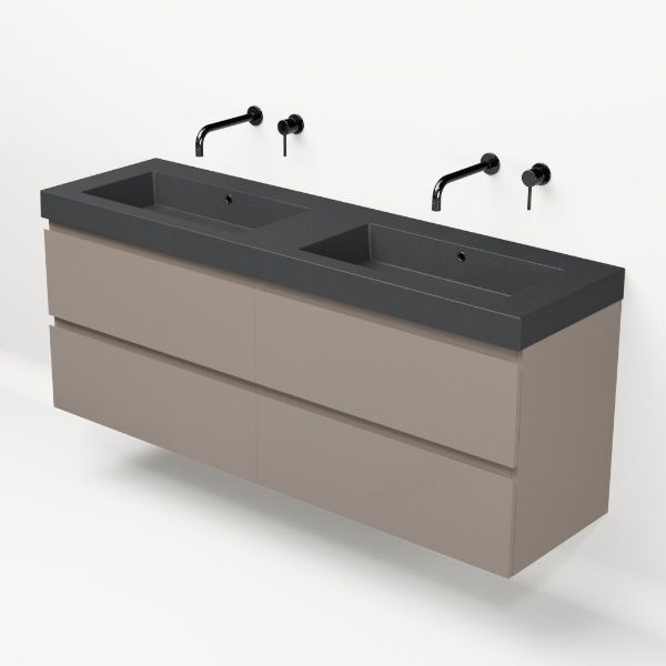 Greeploos badkamermeubel in de kleur taupe is 160 cm breed.  De wastafel is vervaardig in quartz en heeft de kleur grijs mat. Dit badkamermeubel met deze wastafel is leverbaar tussen de 60 cm t/m 200 cm
