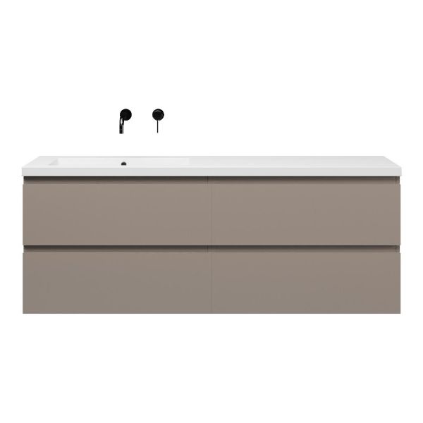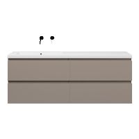 Greeploos badkamermeubel in de kleur taupe is 160 cm breed.  De wastafel is vervaardig in polystone en heeft de kleur wit glans. Dit badkamermeubel met deze wastafel is leverbaar tussen de 60 cm t/m 200 cm