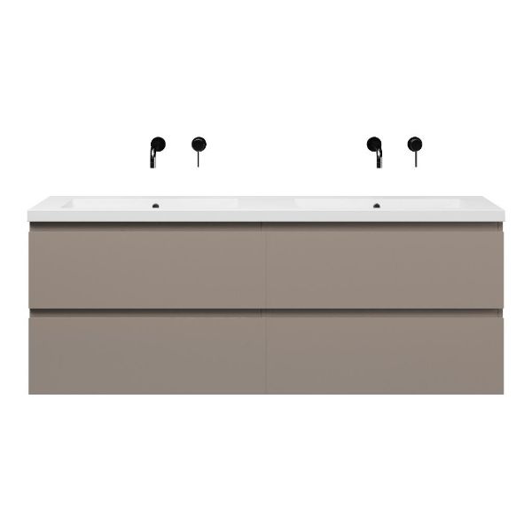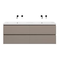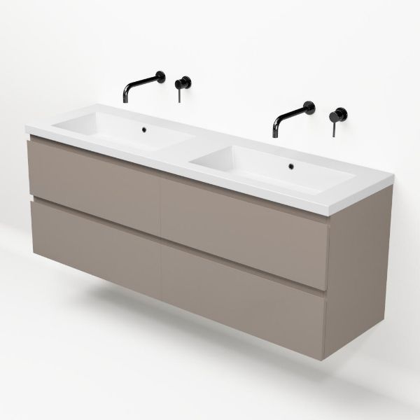 Greeploos badkamermeubel in de kleur taupe is 160 cm breed.  De wastafel is vervaardig in polystone en heeft de kleur wit glans. Dit badkamermeubel met deze wastafel is leverbaar tussen de 60 cm t/m 200 cm