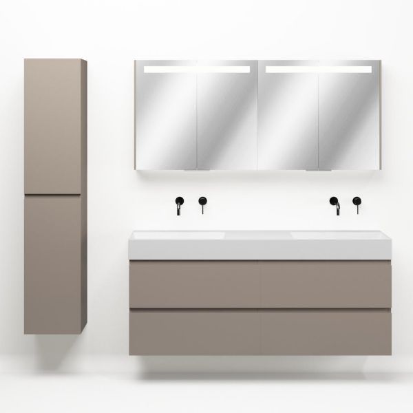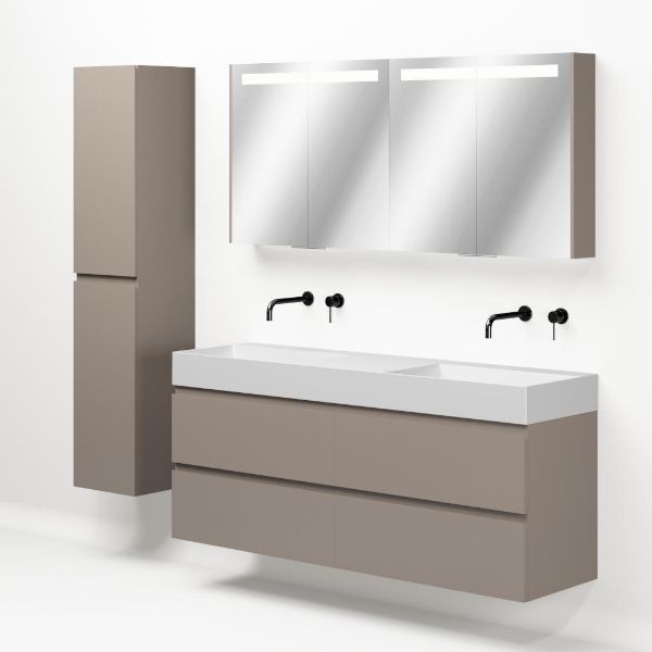 Greeploos badkamermeubel in de kleur taupe is 160 cm breed. De wastafel is vervaardig in keramiek en heeft de kleur wit mat. Dit badkamermeubel met deze wastafel is leverbaar tussen de 60 cm t/m 160 cm