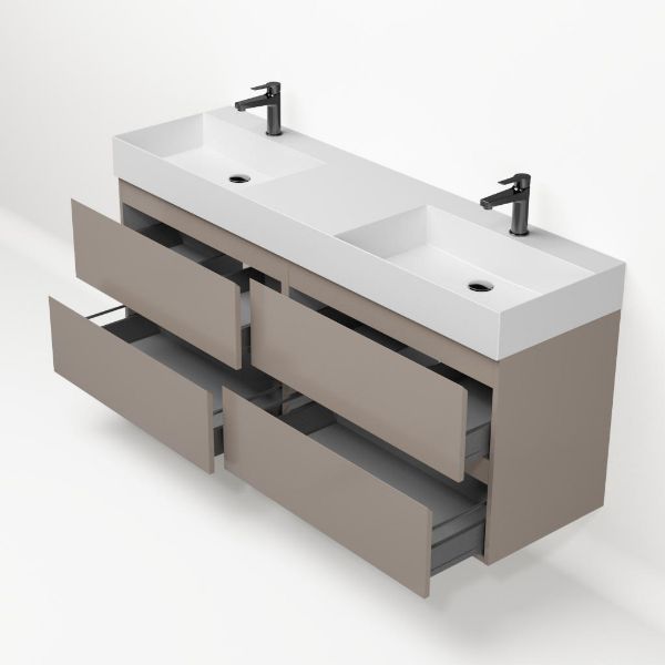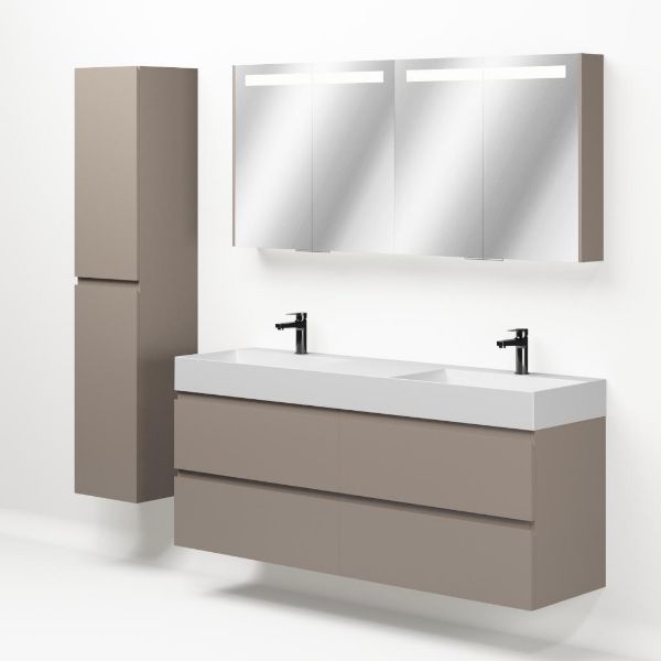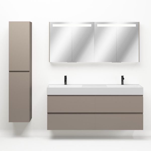Greeploos badkamermeubel in de kleur taupe is 160 cm breed. De wastafel is vervaardig in keramiek en heeft de kleur wit mat. Dit badkamermeubel met deze wastafel is leverbaar tussen de 60 cm t/m 160 cm