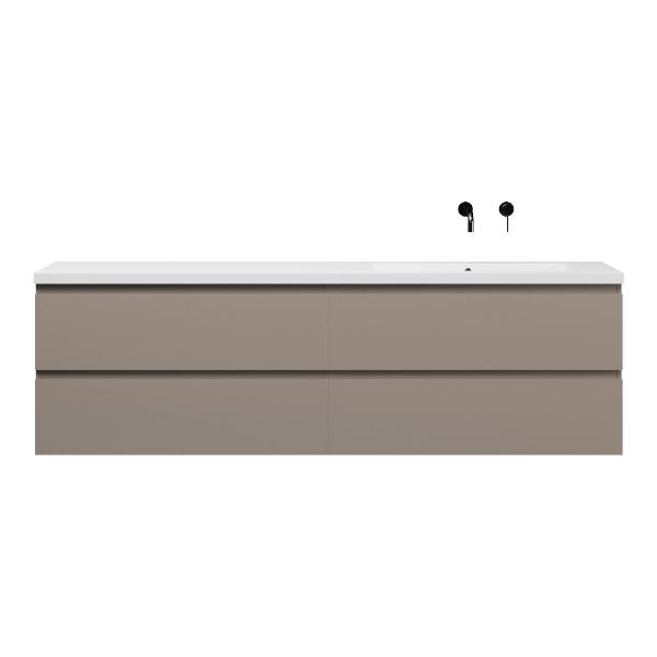 Greeploos badkamermeubel in de kleur taupe is 200 cm breed. De wastafel is vervaardig in polystone en heeft de kleur wit glans. Dit badkamermeubel met deze wastafel is leverbaar tussen de 60 cm t/m 200 cm