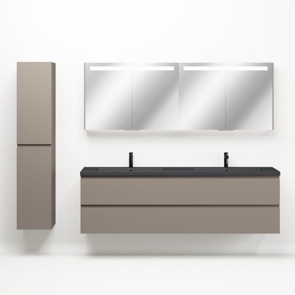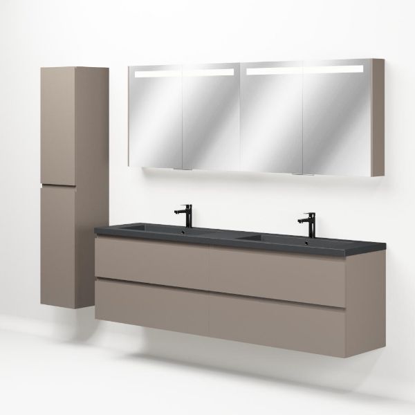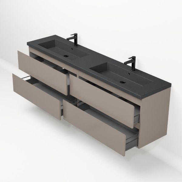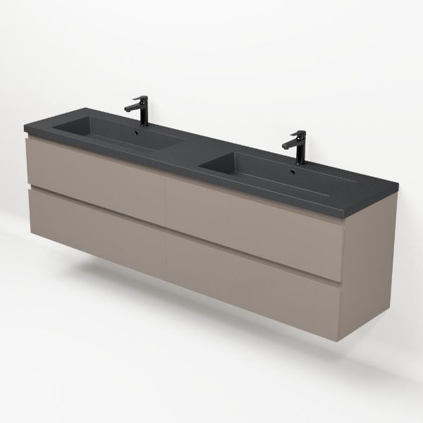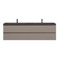 Greeploos badkamermeubel in de kleur taupe is 200 cm breed. De wastafel is vervaardig in quartz en heeft de kleur grijs mat. Dit badkamermeubel met deze wastafel is leverbaar tussen de 60 cm t/m 200 cm
