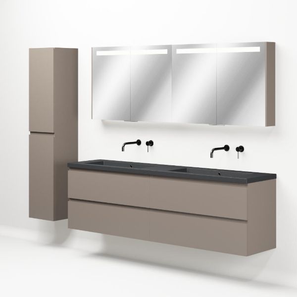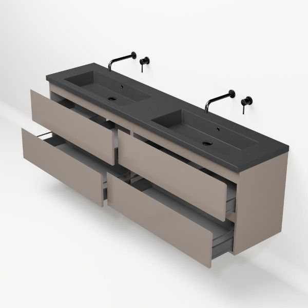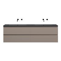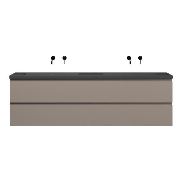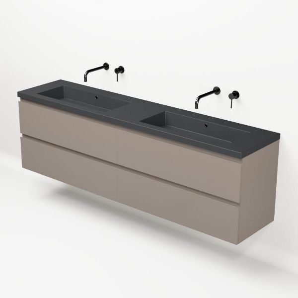 Greeploos badkamermeubel in de kleur taupe is 200 cm breed. De wastafel is vervaardig in quartz en heeft de kleur grijs mat. Dit badkamermeubel met deze wastafel is leverbaar tussen de 60 cm t/m 200 cm