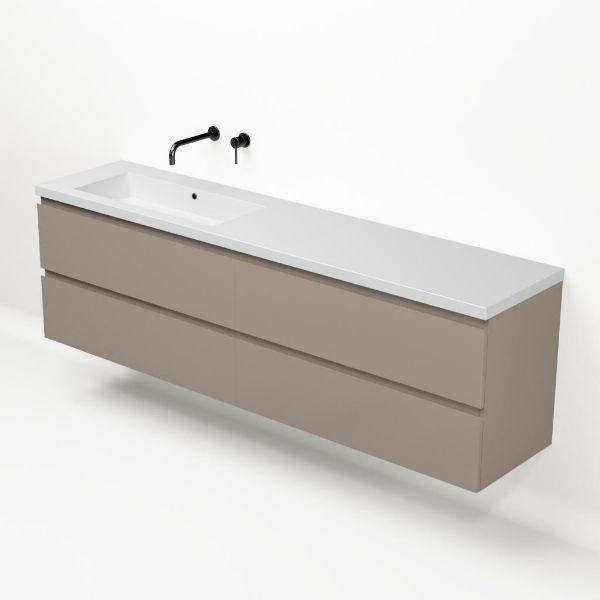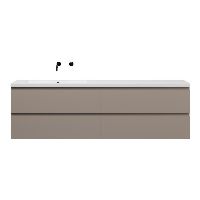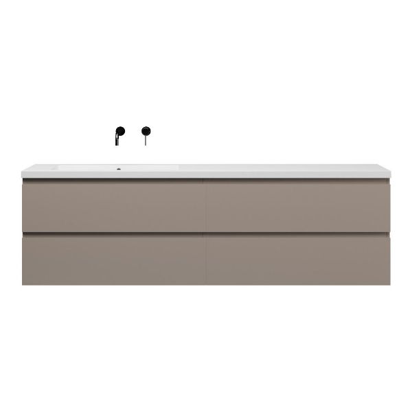 Greeploos badkamermeubel in de kleur taupe is 200 cm breed. De wastafel is vervaardig in quartz en heeft de kleur wit mat. Dit badkamermeubel met deze wastafel is leverbaar tussen de 60 cm t/m 200 cm