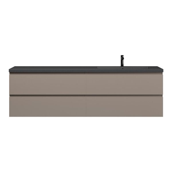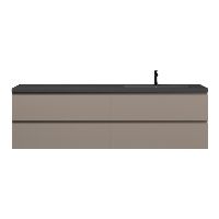 Greeploos badkamermeubel in de kleur taupe is 200 cm breed. De wastafel is vervaardig in quartz en heeft de kleur grijs mat. Dit badkamermeubel met deze wastafel is leverbaar tussen de 60 cm t/m 200 cm