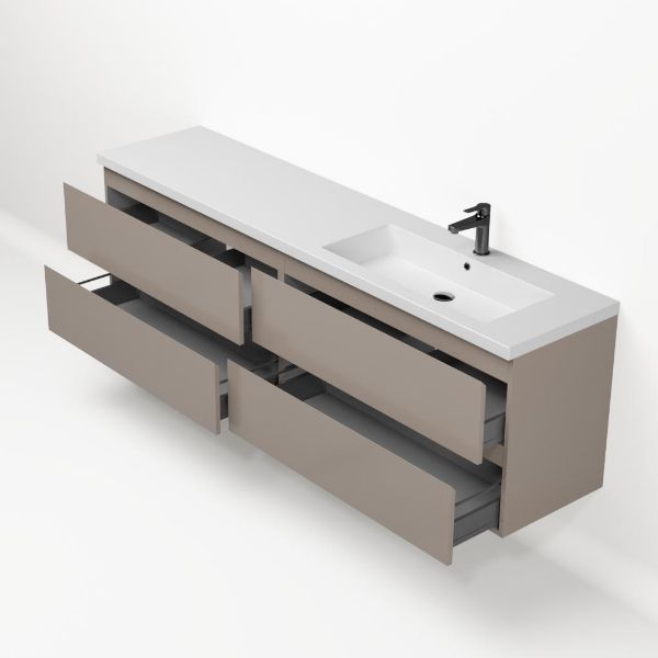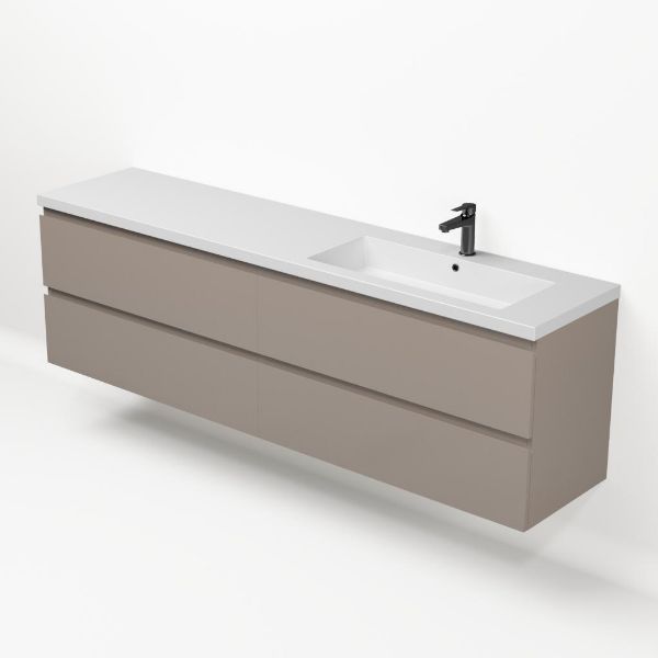 Greeploos badkamermeubel in de kleur taupe is 200 cm breed. De wastafel is vervaardig in quartz en heeft de kleur wit mat. Dit badkamermeubel met deze wastafel is leverbaar tussen de 60 cm t/m 200 cm