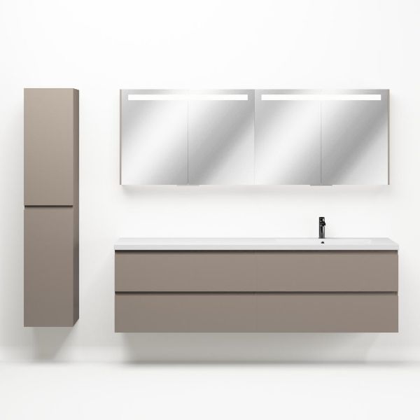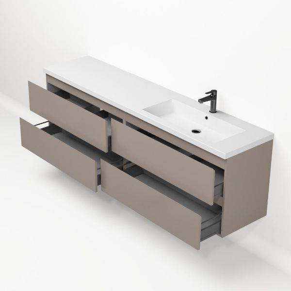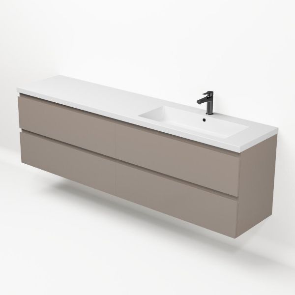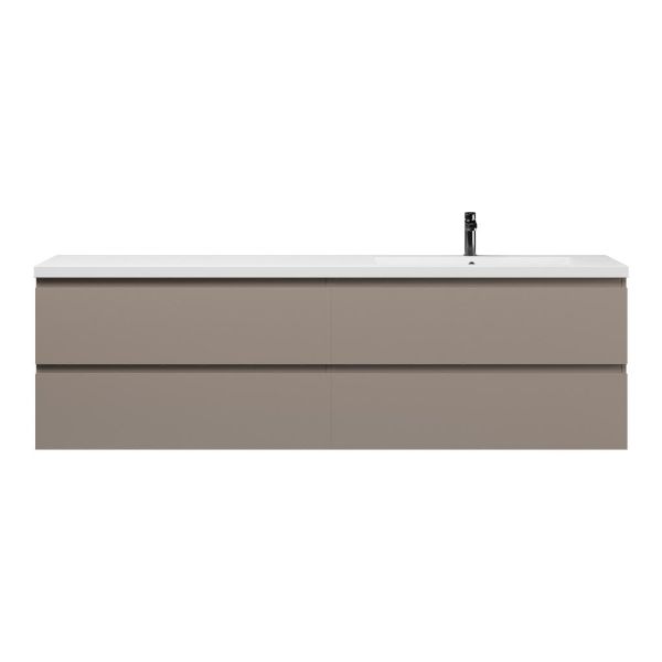 Greeploos badkamermeubel in de kleur taupe is 200 cm breed. De wastafel is vervaardig in polystone en heeft de kleur wit glans. Dit badkamermeubel met deze wastafel is leverbaar tussen de 60 cm t/m 200 cm