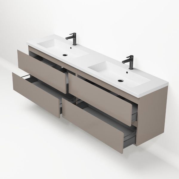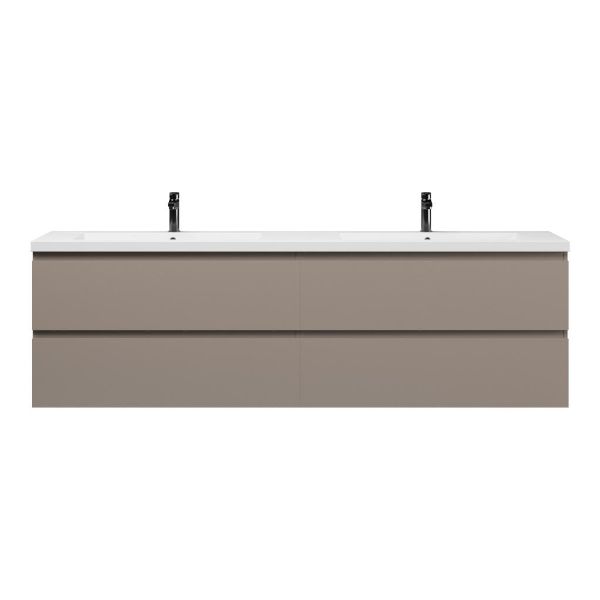Greeploos badkamermeubel in de kleur taupe is 200 cm breed. De wastafel is vervaardig in polystone en heeft de kleur wit glans. Dit badkamermeubel met deze wastafel is leverbaar tussen de 60 cm t/m 200 cm