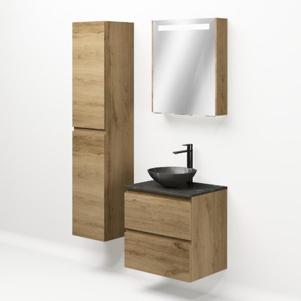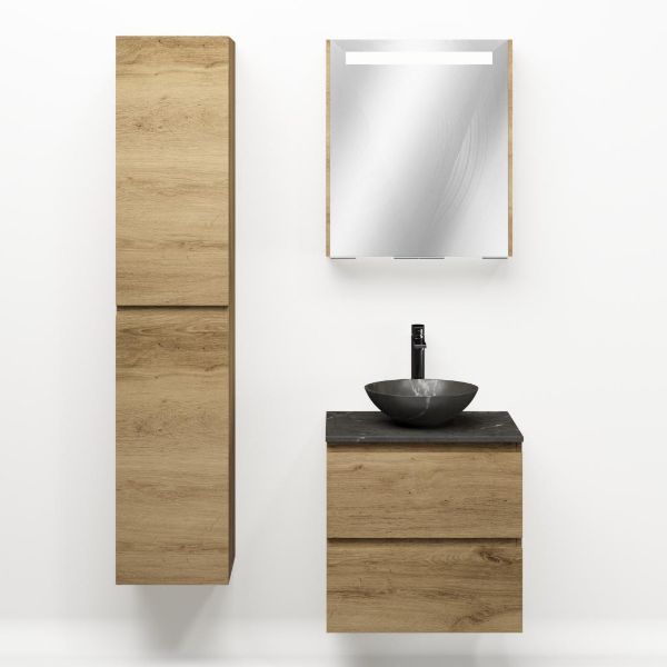 Greeploos badkamermeubel in de kleur eiken warm is 60 cm breed. Op het meubel ligt een afdekplaat met een gelamineerde toplaag of volledig gemaakt van natuursteen.