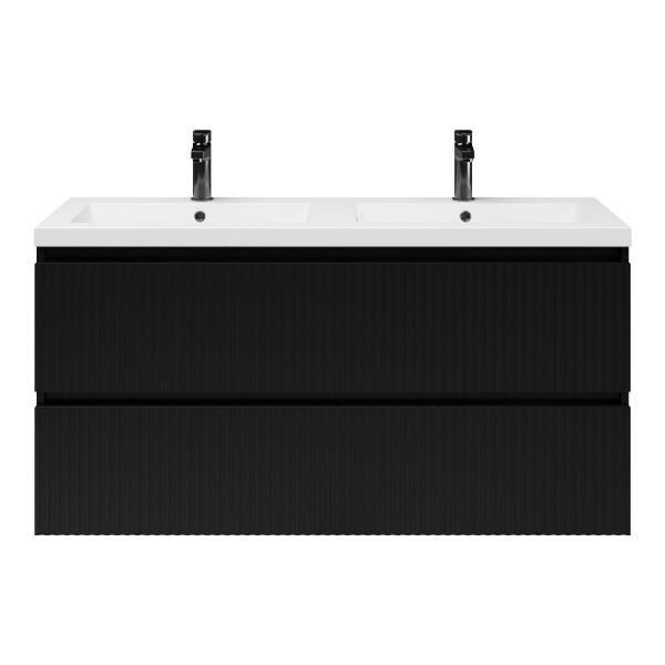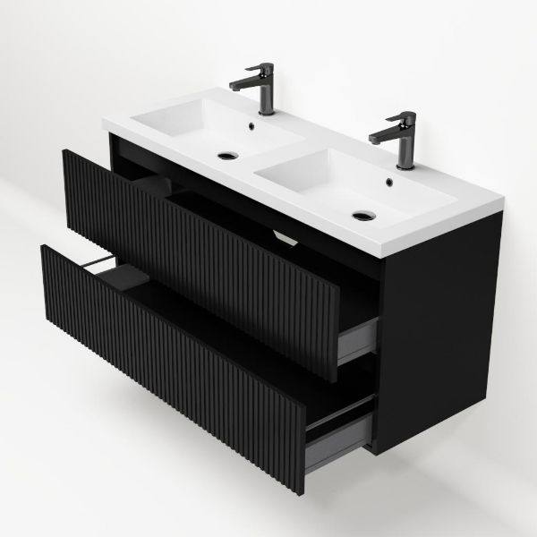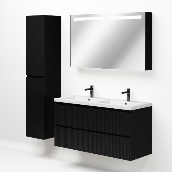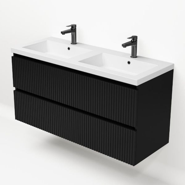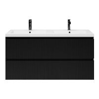 | | Bellanti Silvan/Esta badmeubel 120x46 2 softclose laden met ribbel - latjes structuur mat zwart greeploos polystone wastafel dubbel wit met 2 kraangaten |