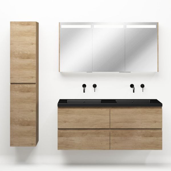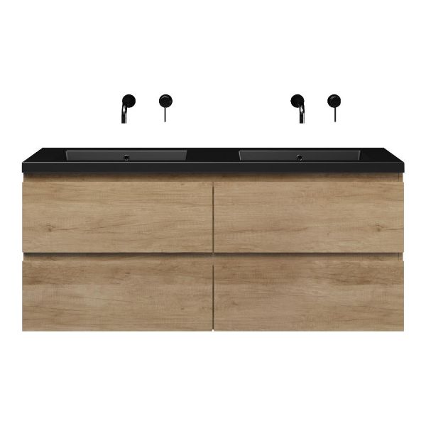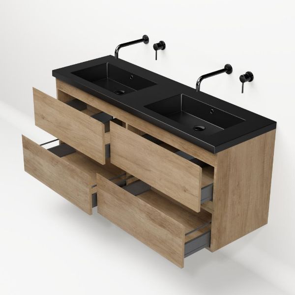 Greeploos badkamermeubel in de kleur olm is 140 cm breed.  De wastafel is vervaardig in polystone en heeft de kleur zwart mat. Dit badkamermeubel met deze wastafel is leverbaar tussen de 60 cm t/m 200 cm