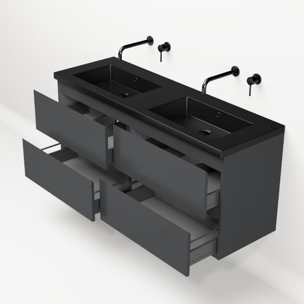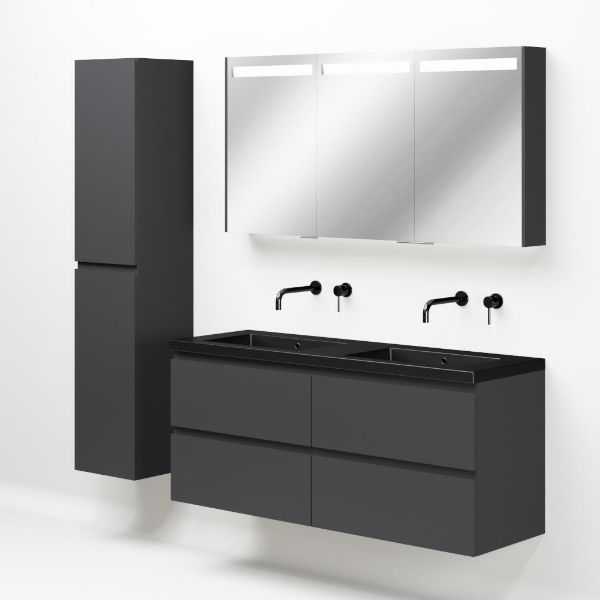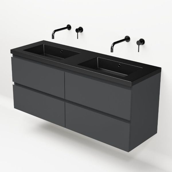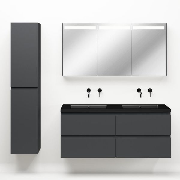 Greeploos badkamermeubel in de kleur antraciet mat is 140 cm breed.  De wastafel is vervaardig in polystone en heeft de kleur zwart mat. Dit badkamermeubel met deze wastafel is leverbaar tussen de 60 cm t/m 200 cm