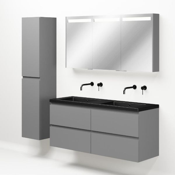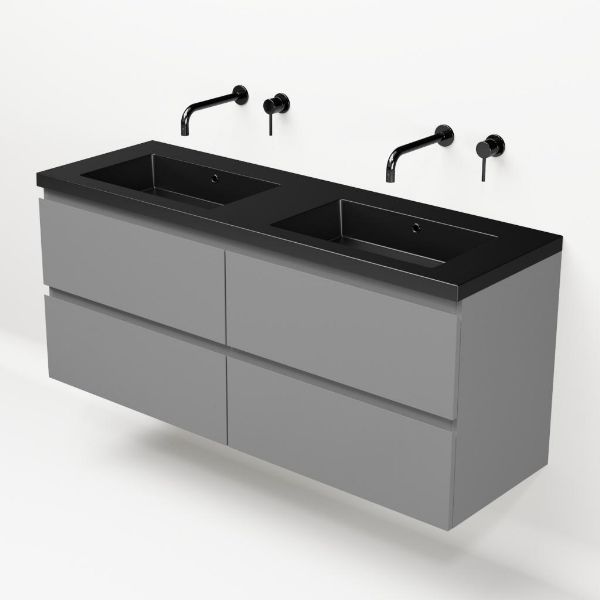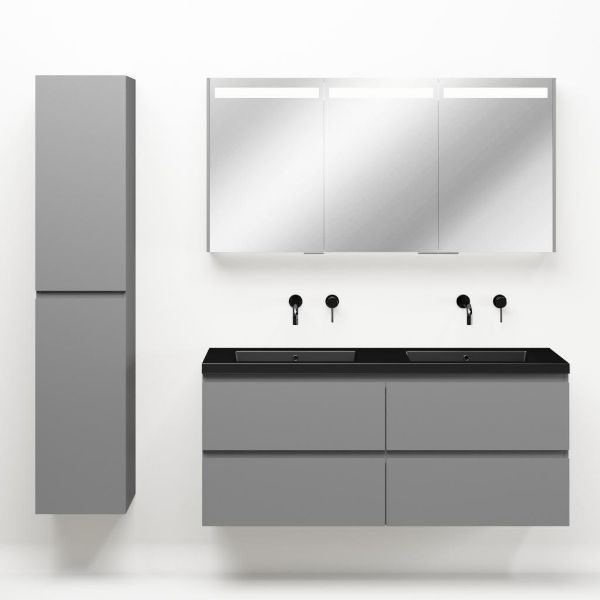 Greeploos badkamermeubel in de kleur licht grijs mat is 140 cm breed.  De wastafel is vervaardig in polystone en heeft de kleur zwart mat. Dit badkamermeubel met deze wastafel is leverbaar tussen de 60 cm t/m 200 cm