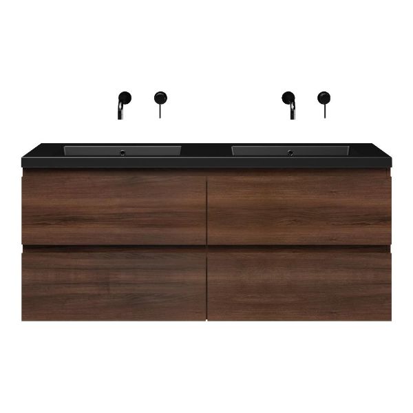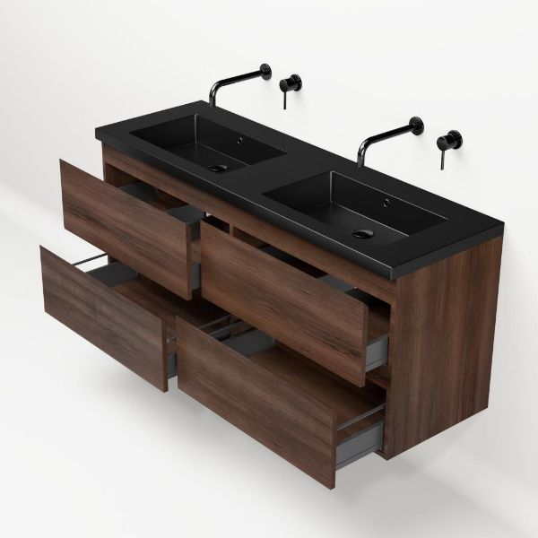 Bellanti Gisella/Esta badmeubel 140x46 4 softclose laden walnoot greeploos polystone wastafel dubbel zwart mat zonder kraangaten