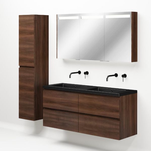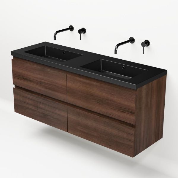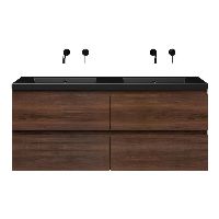Greeploos badkamermeubel in de kleur walnoot is 140 cm breed.  De wastafel is vervaardig in polystone en heeft de kleur zwart mat. Dit badkamermeubel met deze wastafel is leverbaar tussen de 60 cm t/m 200 cm