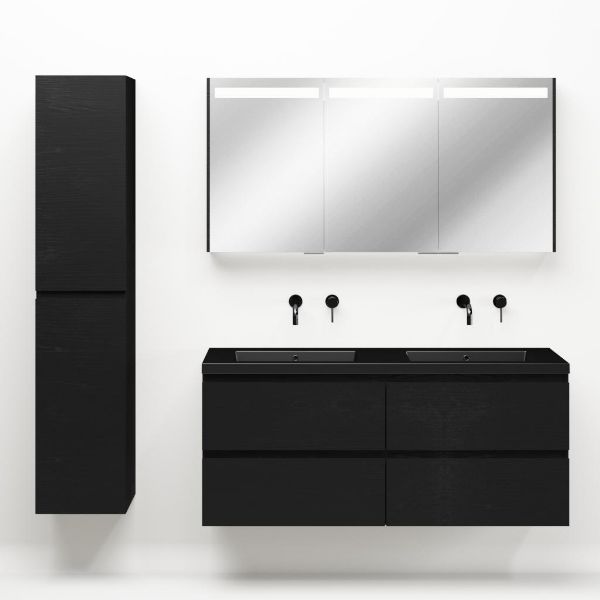 Greeploos badkamermeubel in de kleur zwart mat eiken is 140 cm breed.  De wastafel is vervaardig in polystone en heeft de kleur zwart mat. Dit badkamermeubel met deze wastafel is leverbaar tussen de 60 cm t/m 200 cm
