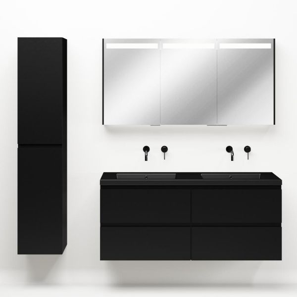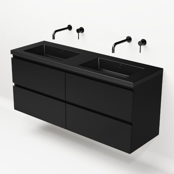 Greeploos badkamermeubel in de kleur zwart mat is 140 cm breed.  De wastafel is vervaardig in polystone en heeft de kleur zwart mat. Dit badkamermeubel met deze wastafel is leverbaar tussen de 60 cm t/m 200 cm
