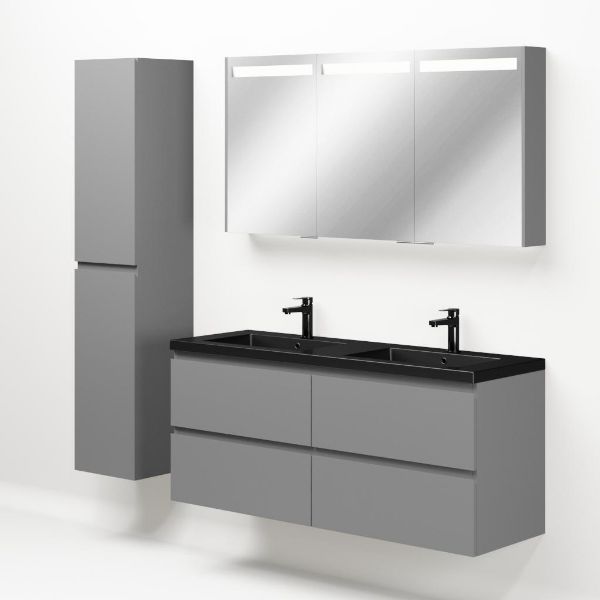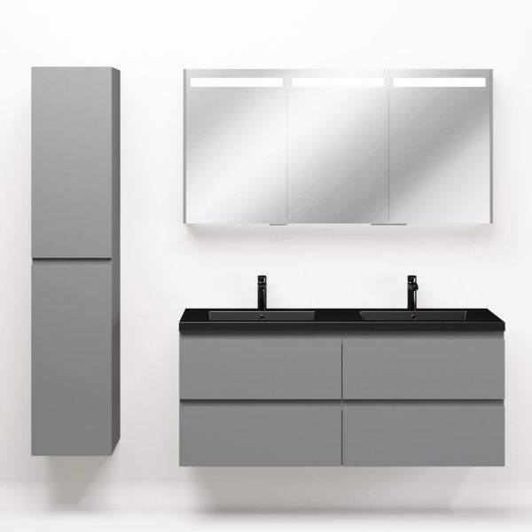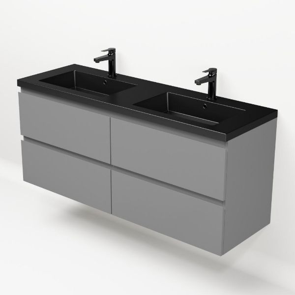 Greeploos badkamermeubel in de kleur licht grijs mat is 140 cm breed.  De wastafel is vervaardig in polystone en heeft de kleur zwart mat. Dit badkamermeubel met deze wastafel is leverbaar tussen de 60 cm t/m 200 cm