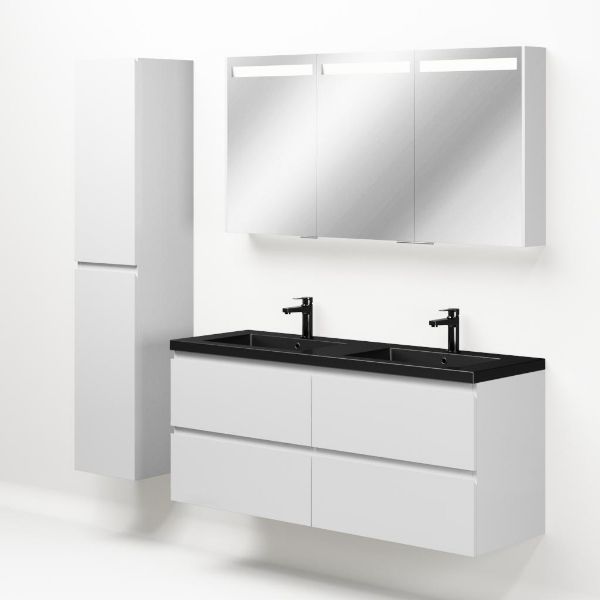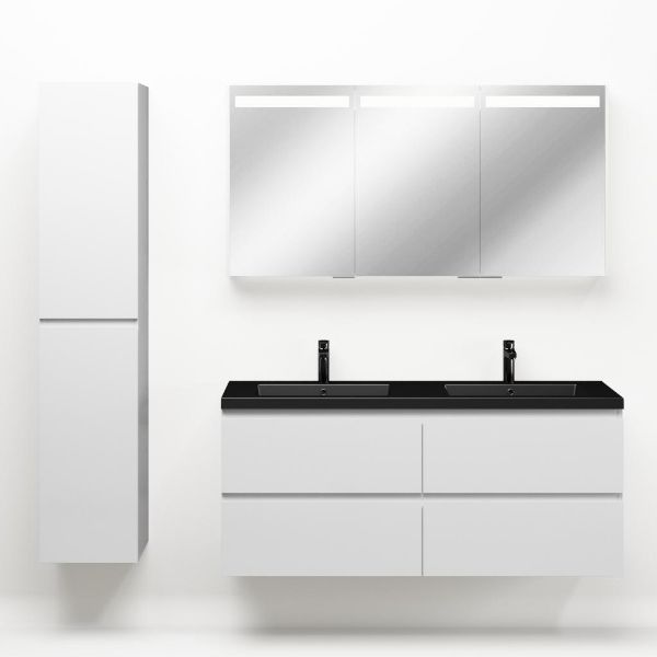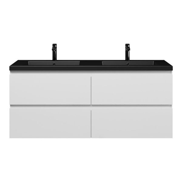 Greeploos badkamermeubel in de kleur wit hoogglans is 140 cm breed.  De wastafel is vervaardig in polystone en heeft de kleur zwart mat. Dit badkamermeubel met deze wastafel is leverbaar tussen de 60 cm t/m 200 cm