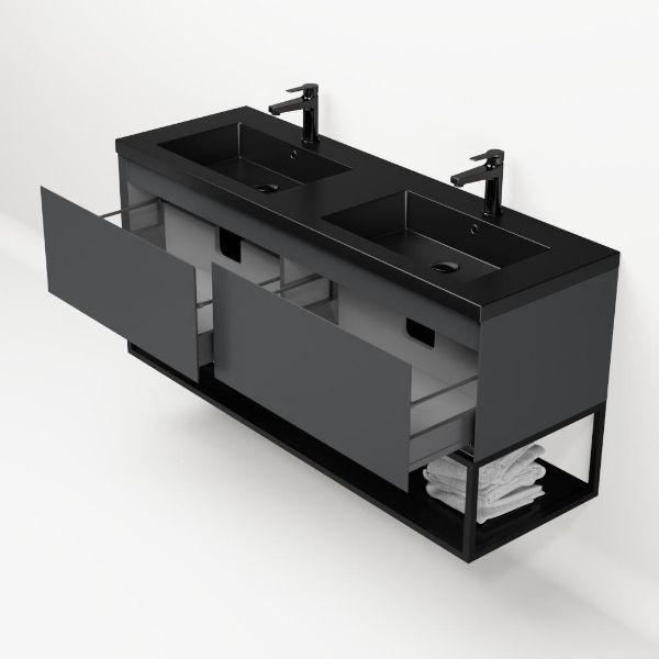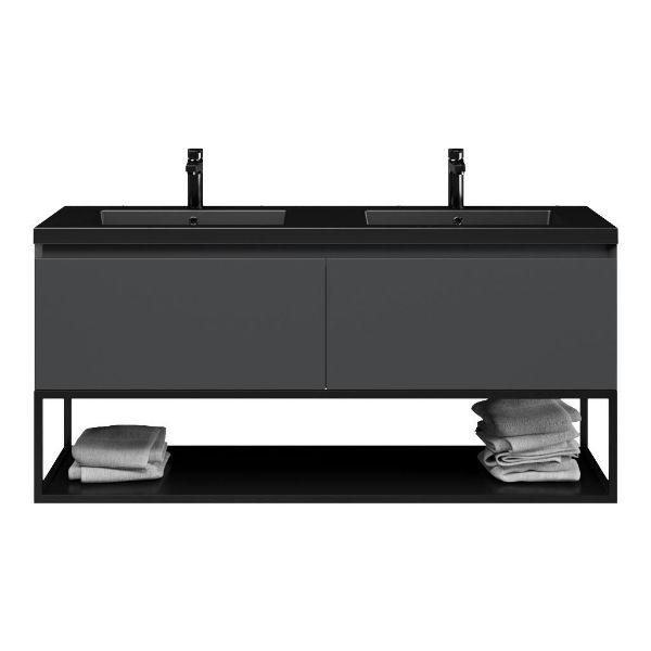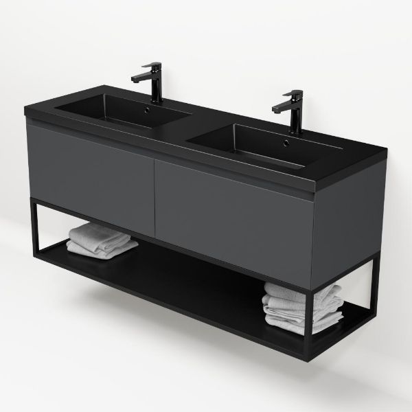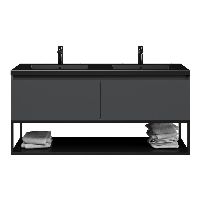 Bellanti Solo/Tela/Esta badmeubel 140x46 2 softclose laden antraciet mat greeploos polystone wastafel dubbel mar zwart met 2 kraangaten met mat zwart metalen frame