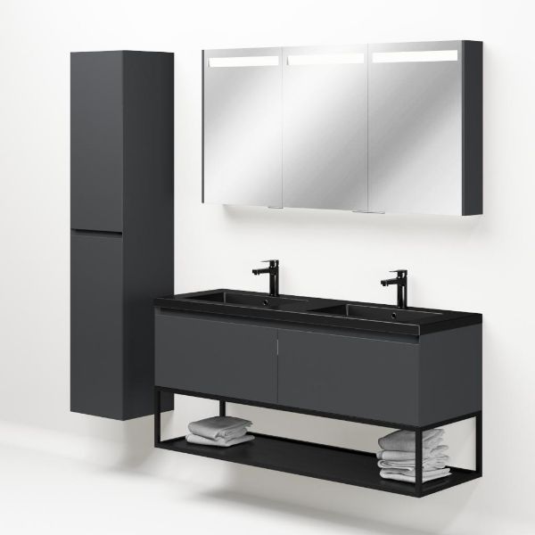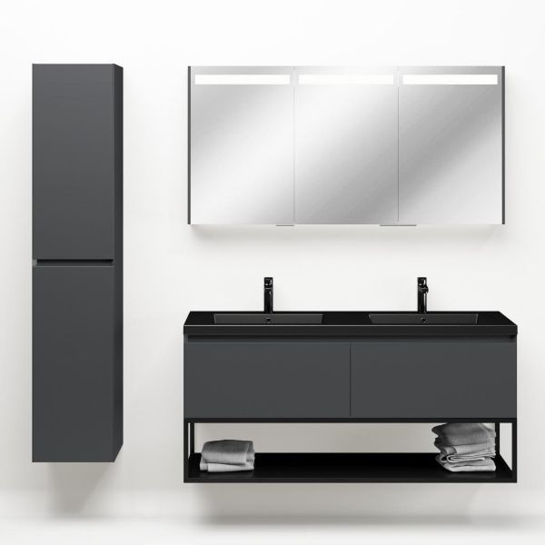 Greeploos badkamermeubel in de kleur antraciet mat is 140 cm breed.  De wastafel is vervaardig in polystone en heeft de kleur zwart mat. Dit badkamermeubel met deze wastafel is leverbaar tussen de 60 cm t/m 160 cm