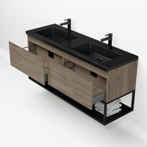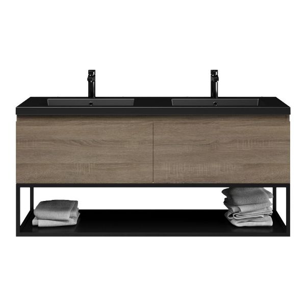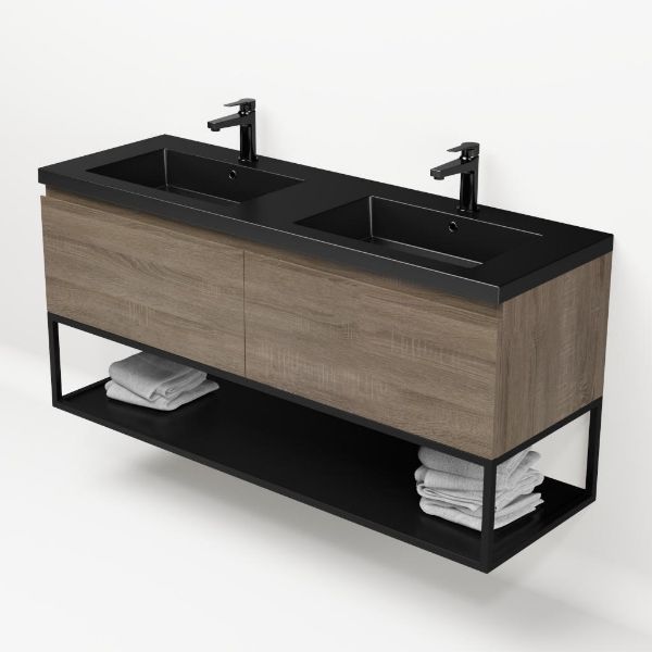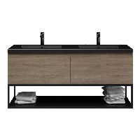 Bellanti Solo/Tela/Esta badmeubel 140x46 2 softclose laden eiken donker greeploos polystone wastafel dubbel mar zwart met 2 kraangaten met mat zwart metalen frame
